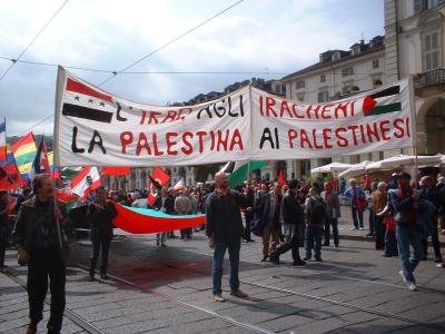 maggio dietro lo striscione unitario "Iraq agli iracheni – Palestina ai