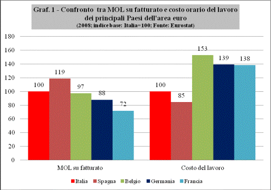 Di solito Confindustria aggiunge nelle sue argomentazioni per il taglio del costo del lavoro che in Italia i salari sono bassi, oltre che per colpa del costo del lavoro troppo alto, anche per colpa della ridotta produttività. In realtà la produttività italiana è bassa proprio perché le retribuzioni e il costo del lavoro sono bassi. Infatti, lì dove c'è abbondanza di forza-lavoro a basso costo le imprese evitano di investire in mezzi tecnici, diminuendo la quota di capitale per addetto, e quindi la produttività del capitale. Non scordiamo che la produttività totale dei fattori si compone di produttività del lavoro e del capitale. Negli ultimi 15 anni non è certo la prima ad essere crollata, grazie a tempi di lavoro più intensi e più lunghi, bensì la seconda. Il calo della produttività totale dei fattori è stato causato proprio dalle controriforme del mercato del lavoro degli ultimi 15 anni, dal pacchetto Treu alla Legge 30, come hanno dimostrato due studi, uno del Fondo Monetario Internazionale e un altro di economisti dell'Università di Harvard e della Northwestern University[5]. Infatti, la deregolamentazione del mercato del lavoro, unitamente alla maggiore offerta di forza lavoro femminile e immigrata (di base meno pagata), ha aumentato l'offerta totale di lavoro in presenza di domanda stagnante o più ridotta. Come sempre accade quando l'offerta di forza-lavoro è maggiore della domanda, i salari sono diminuiti e le imprese hanno perso la spinta a innovare e ad aumentare la quota di capitale tecnico per addetto, per mantenere alto il margine di profitto, che viene comunque garantito dai bassi salari. È significativo che in Italia e Spagna, dove le controriforme del mercato del lavoro sono state più intense e salari e costo del lavoro sono più bassi, il Margine operativo lordo (Mol) sul fatturato è nettamente più alto che in Germania e Francia (Graf.1). In Italia e Spagna rispettivamente 7,5% e 8,9%, in Germania e Francia, 6,6% e 5,4% [6]. In conclusione, si può affermare che la nuova riforma del mercato del lavoro, introducendo nuova flessibilità in uscita e in entrata, non può che produrre una ulteriore contrazione, nello stesso tempo, di salario e produttività totale.