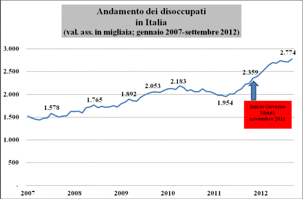 Successivamente, con il passaggio ad una politica incentrata su drastici tagli della spesa pubblica per ridurre i deficit pubblici, la disoccupazione è esplosa. Il fenomeno è evidente anche in Italia. In 24 mesi, nel periodo peggiore della crisi tra gennaio 2008 e dicembre 2009, i disoccupati aumentarono di 463mila unità. In soli dieci mesi, tra novembre 2011, data d'insediamento del governo Monti, e settembre 2012, sono aumentati di 416mila unità, passando dai 2 milioni e 359mila di novembre 20011 ai 2milioni e 774mila di settembre 2012 (vedi grafico)[9]. La Bce di Mario Draghi ritiene che la principale causa della disoccupazione strutturale non sia la crisi ma l'eccessiva rigidità salariale. La soluzione, quindi, sarebbe garantire maggiore flessibilità salariale proseguendo con le "riforme del mercato del lavoro", come quelle che si stanno portando avanti in Italia (riforma Fornero), Grecia, Portogallo, Irlanda e Spagna. Peccato, che ad oggi, il potere d'acquisto dei lavoratori si sia ridotto senza che la disoccupazione abbia smesso di crescere. Il punto è che oggi in Europa, come negli Usa, si tende a ricostituire un ampio "esercito industriale di riserva", come era definito da Marx, che consista di lavoratori a tempo che possano essere agevolmente inseriti e dismessi a seconda dei cicli di una economia che è destinata a mantenersi per chissà quanto tempo ad un bassissimo tasso di crescita e molto lontana dalla piena occupazione. Visto che le riduzioni salariali e del costo del lavoro non hanno mai creato maggiore occupazione, l'obiettivo reale delle riforme del mercato del lavoro è quello di contrastare la caduta del saggio di profitto e la sempre più agguerrita concorrenza mondiale comprimendo i salari di milioni di lavoratori a livelli di sussistenza o addirittura al disotto di tale livello. Archiviata la società del benessere e dei consumi, con buona pace dei teorici della "decrescita felice", fa ritorno sulla scena sociale la figura del working poor o "povero che lavora", ricattabile e disposto ad accettare condizioni e ritmi di lavoro peggiori. Del resto, che importa se il salario reale cala? Non è il mercato interno che interessa alle grandi imprese multinazionali ma quello mondiale. È il modello tedesco ad affermarsi. Peccato che, se tutti fanno così, sarà il mercato mondiale a crollare, così come è crollato quello dell'area euro. Uno scenario che potrebbe diventare presto realtà, specialmente se gli Usa, dopo le elezioni presidenziali, rinunciassero allo strumento dello stimolo fiscale per affrontare il fiscal cliff.