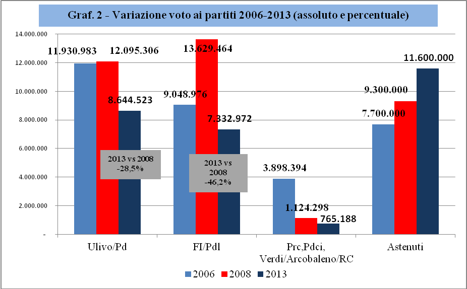Particolarmente interessante è vedere l'andamento del voto alla sinistra (Prc, PdCI e Verdi). Questa prosegue inarrestabilmente la sua tendenza al calo di consensi, anche se il crollo maggiore, come si vede chiaramente dal grafico, si colloca tra 2006 e 2008, cioè successivamente alla partecipazione al governo Prodi II. Infatti, tra 2006 e 2008 si registra una flessione del -71% dei voti, mentre tra 2008 e 2013 la flessione è del -31%. Pure impressionante è l'andamento delle astensioni che, in tre turni elettorali, aumentano di 4 milioni, pari al + 50,6%. Potremmo dire che il primo partito, nonché la prima coalizione, in Italia è di chi non partecipa al voto.