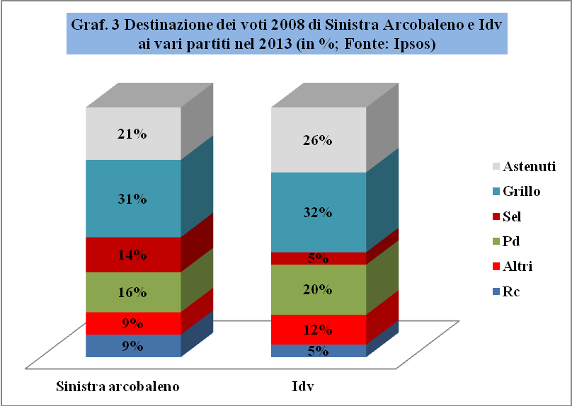 Se consideriamo anche l'Idv, abbiamo delle conferme alle tendenze più importanti. L'Idv di fatto alle elezioni del 2013 si disintegra, probabilmente a causa dell'effetto comobinato del suo essere un partito «personale» e dello scandalo sui rimborsi che ha coinvolto di Pietro e che impatta maggiormente sul suo elettoralo, molto sensibile alla tematica. Tra gli elettori 2008 dell'Idv il voto di protesta è più alto ancora che nell'Arcobaleno, arrivando al 58%, quello a Sel è solo del 5%, e quello al Pd è del 20%, circa un terzo del voto di protesta.