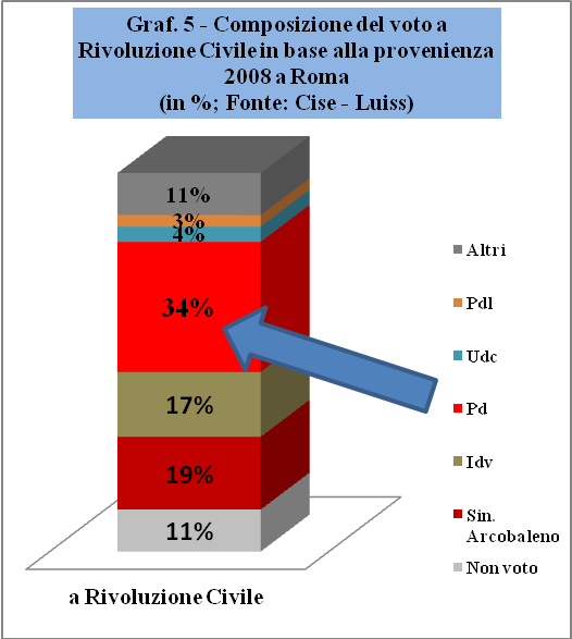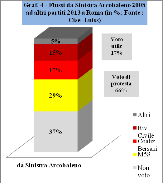 Nel Graf. 4, le tendenze nazionali, descritte dall'Ipsos, sono largamente confermate. Infatti, il flusso del voto di protesta, a Roma, ha un peso ancora maggiore, ammontando al 66% del voto dell'Arcobaleno, di cui il 37% al non voto e il 29% all'M5S. Alla coalizione di centrosinistra (in questo caso il dato di Sel e Pd non è scorporato) va appena il 17% del voto del 2008.