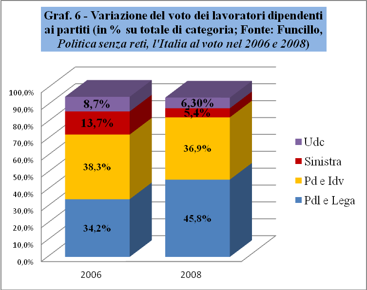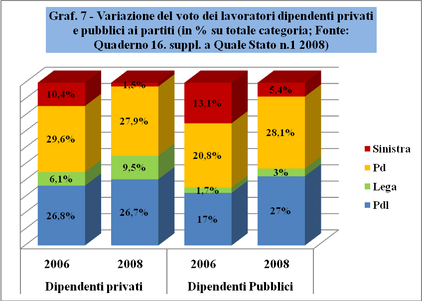 Come vediamo nel Graf. 6, a perdere di più tra le due tornate elettorali 2006-2008 è proprio la sinistra, che si riduce ai due quindi del voto dei lavoratori dipendenti, passando dal 13,7% dei dipendenti totali ad appena il 5,4%. La sinistra è superata persino dall'Udc che, pure calando dall'8,7%, raccoglie il 6,3%. Pd e Idv perdono molto poco, appena l'1,4%, passando dal 38,3% al 36,9%. A guadagnare ben oltre dieci punti sono Pdl e Lega, che passano dal 34,2% al 45,8%. Un'altra ricerca ci fornisce le stime riguardanti separatamente i dipendenti pubblici da quelli privati. Innanzi tutto, c'è da notare una certa differenza nel comportamento elettorale tra i dipendenti privati, tra i quali è compresa la classe operaia tradizionale, e i dipendenti pubblici. Tra i dipendenti pubblici solo la Sinistra Arcobaleno perde, passando dal 13,1% al 5,4%. Tutti gli altri partiti guadagnano, in particolare il Pdl che incrementa di dieci punti (dal 17% al 27%), il Pd di quasi 8 punti (dal 20,8% al 28,1%) e la Lega (dall'1,7% al 3,5%).