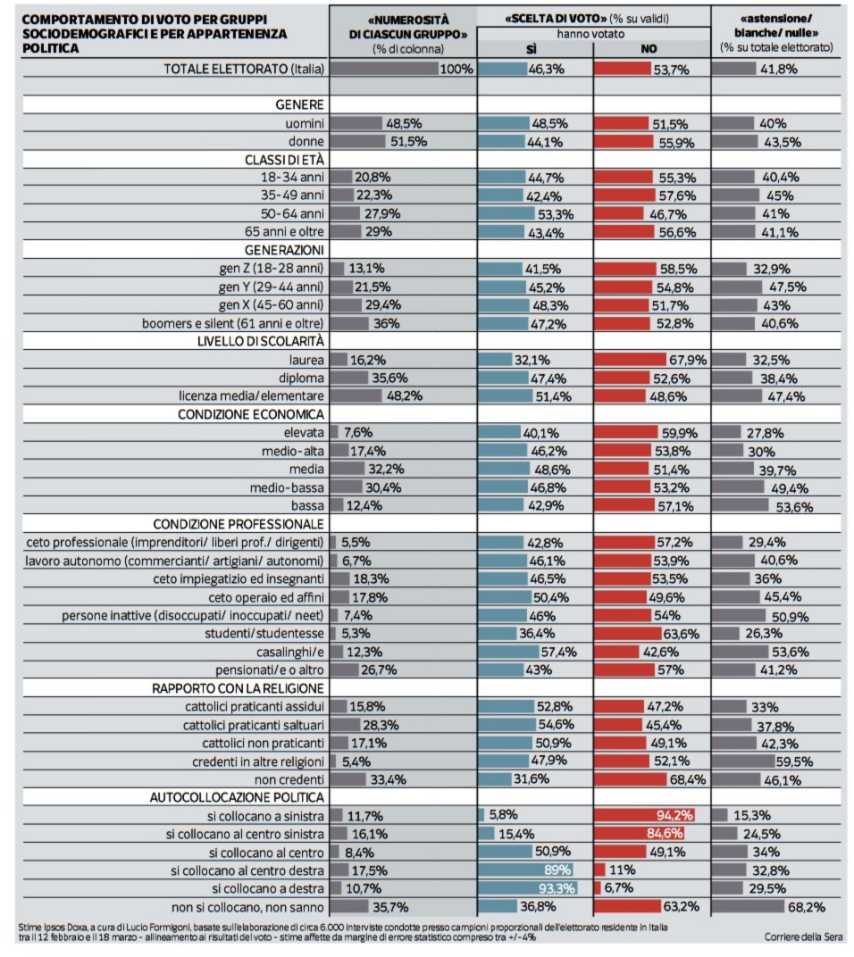 E lo è stato non solo per le caratteristiche sociali e geografiche di chi ha votato NO, ma lo è anche per il segnale tutto politico che ha inviato sia al governo che al cosiddetto "campo largo" dell'opposizione. Su questo invitiamo a leggere con attenzione il grafico in coda a questo articolo.