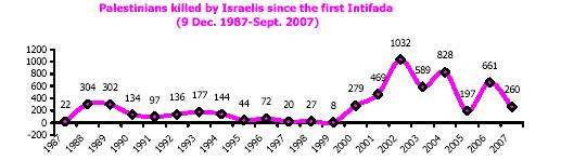 Secondo le statistiche di Defence for Children International sezione palestinese (DCI-Palestine), un totale di 898 bambini sono stati uccisi dall’inizio della seconda Intifada, di cui 46 nel solo 2007 (al 27 ottobre 2007). Di questi, 127 erano sotto i 9 anni, 144 tra 9 e 12, 307 tra 13 e 15 e 320 tra 16 e 17 anni.