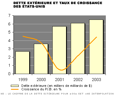 Gli Stati Uniti hanno finanziato la loro crescita con l’indebitamento. Nel 2002, il paese conosceva il suo primo déficit di bilancio dopo il 1997. Questo, a poco a poco è sprofondato dall’1,5 % del 2002 al 3,5 % nel 2003, per arrivare al 4,2 % nel 2004.