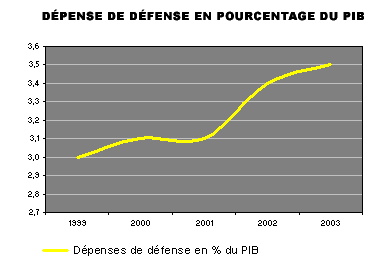 Le spese per la difesa (dépenses de défense) sono passate dal 3,1 % del PIL nel 2001 al 3,4 % nel 2002, e al 3,5 % nel 2003. Vedi tabella: