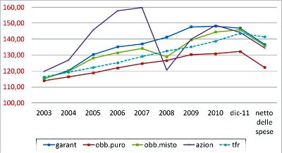 mostriamo dal 2003 al 2011). La figura mostra chiaramente 3 cose: la prima è quella che il TFR rende di più. La seconda osservazione è che una caduta nel rendimento pregiudica per anni la rendita. Considerando che negli ultimi 10 anni ci sono state 3 bolle speculative (torri gemelle, bolla immobiliare, debito “sovrano” dei PIIGS), è dimostrato che la crisi è continua e viene usata per erodere i risparmi di chi vi investe, più o meno coscientemente. L’ultima osservazione è che se si va in pensione in un anno di “magra” il rateo stesso rimarrà basso, al di là della quantità di denaro investito.
