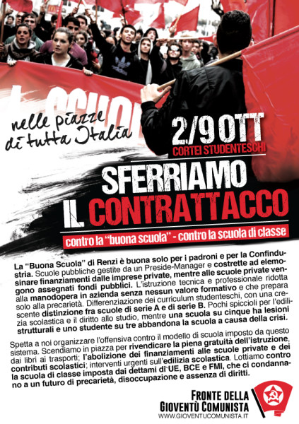 Il Fronte della Gioventù Comunista sarà in piazza con i propri spezzoni studenteschi nelle principali città italiane nei giorni delle mobilitazioni annunciate per il mese di ottobre. Rilanciamo le date del 2 e del 9 ottobre, sebbene riteniamo questa suddivisione in due date un sintomo dell'arretratezza e dell'insufficienza delle strutture studentesche oggi esistenti dinanzi all'enorme attacco ai diritti che viene condotto.